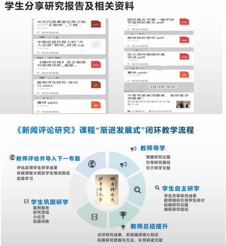 线上教学虽然阻隔了师生之间面对面的交互,但不影响彼此间的交流,新闻与传播专业充分利用线上教学的网络优势,一定程度上提升了研学效率。姜昕老师执教的《新闻评论研究》为新闻传播实务方向硕士生的特色课,强调学生理论水平、研究能力和实践能力的全方位提升。在该目标导向下,课程学习更加注重系统性、综合性和成长性。为此,姜昕老师设计实施了“教师导学—学生自主研学—教师总结提升—学生巩固研学—教师评估并导入下一专题研学”的“渐进发展式”闭环教学模式,这套方案在线上教学过程中运行流畅。