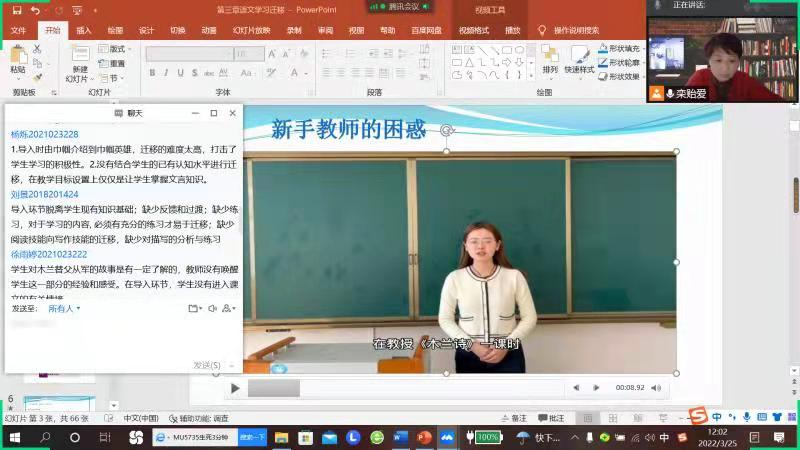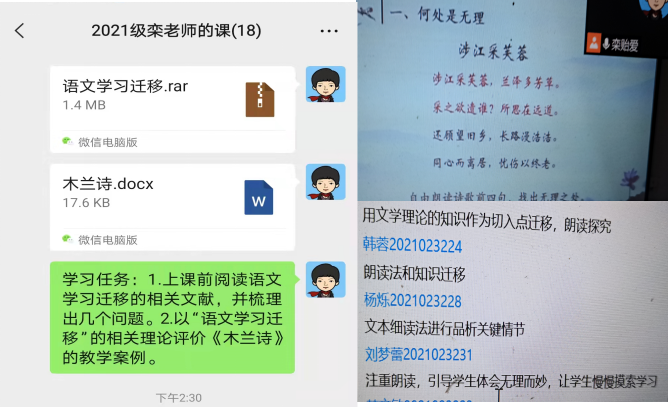 疫情封校期间,针对教学环境改变给教育硕士学习带来的教学模态异位及教学认知疏离的问题,学科教学(语文)专业课教学开展了基于真实视频案例的探索。栾贻爱老师在执教《语文学科学习理论与方法》课时,邀请一线教师拍摄真实教学困惑视频,以真实问题切入,引导研究生运用相关语文教育理论探讨解决方案,通过跨界研讨促进学习投入,提升研究设计能力。具体实施如下:课前通过微信群推送预习资料发送学习任务单,鼓励学生自学;课中通过腾讯课堂开展“设置情境—尝试解决、理论引导—学习建构、思维点拨—合作改进、回授指导—整合拓展”的五环节教学。上课伊始引入真实的语文教学关键事件,激发学生认知矛盾,然后搭建支架以层层递进的“关键事件”为动力推动教学,课尾拓展新任务情境。