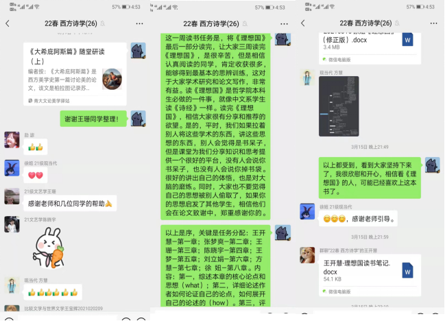 周思钊老师讲授的《西方诗学》是文艺学、中国现当代文学、比较文学与世界文学三个学科同时必修的一门理论课程,为克服学生对理论书籍缺乏兴趣、不愿阅读理论文本的问题,周老师创新教学模式,申请课程公众号“青大文论美学驿站”,采用任务驱动式教学,以文本研读为核心开展研讨式教学。他精心选择10部西方文论名著,每周要求学生精读文本150页,形成读书报告,下周上课前分享至微信群,保证课堂开展有质量的学术讨论。最后将做课堂记录整理,经教师审核后,发表在课程公众号上,供学生温习。