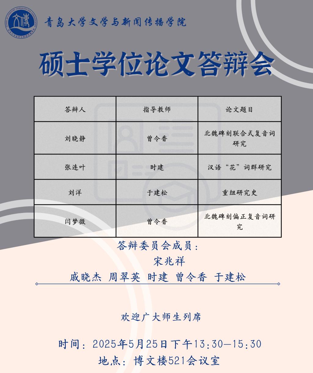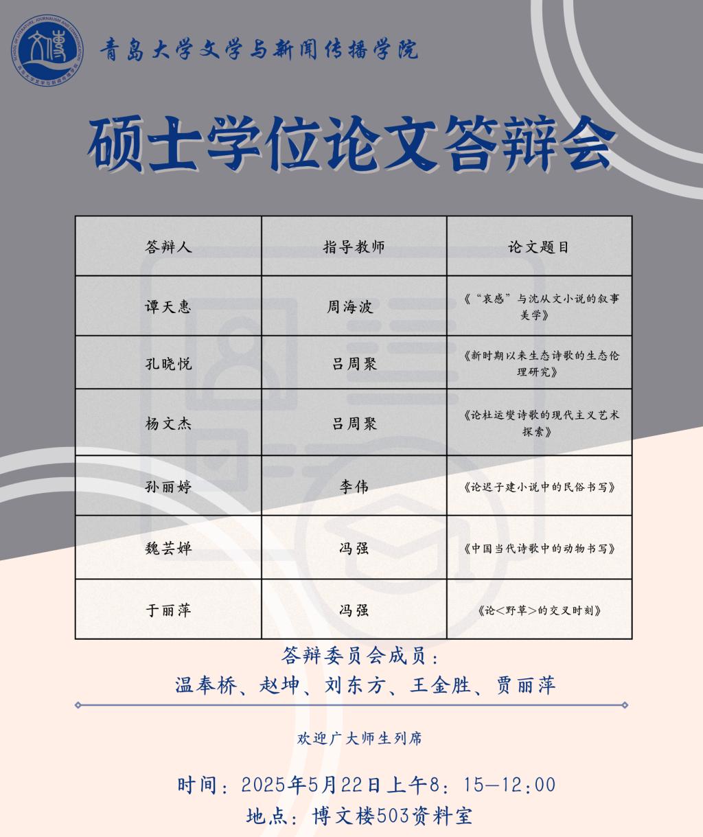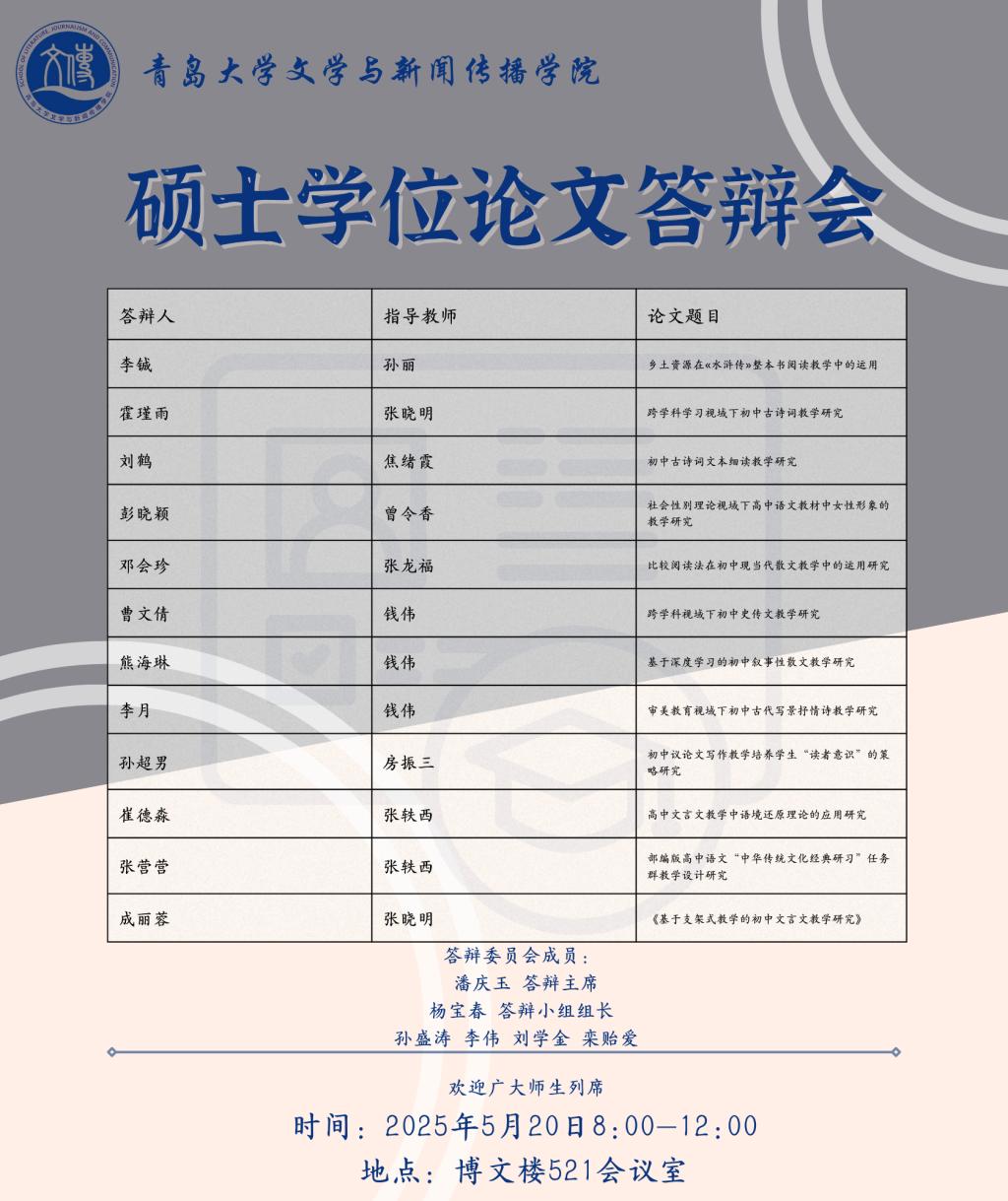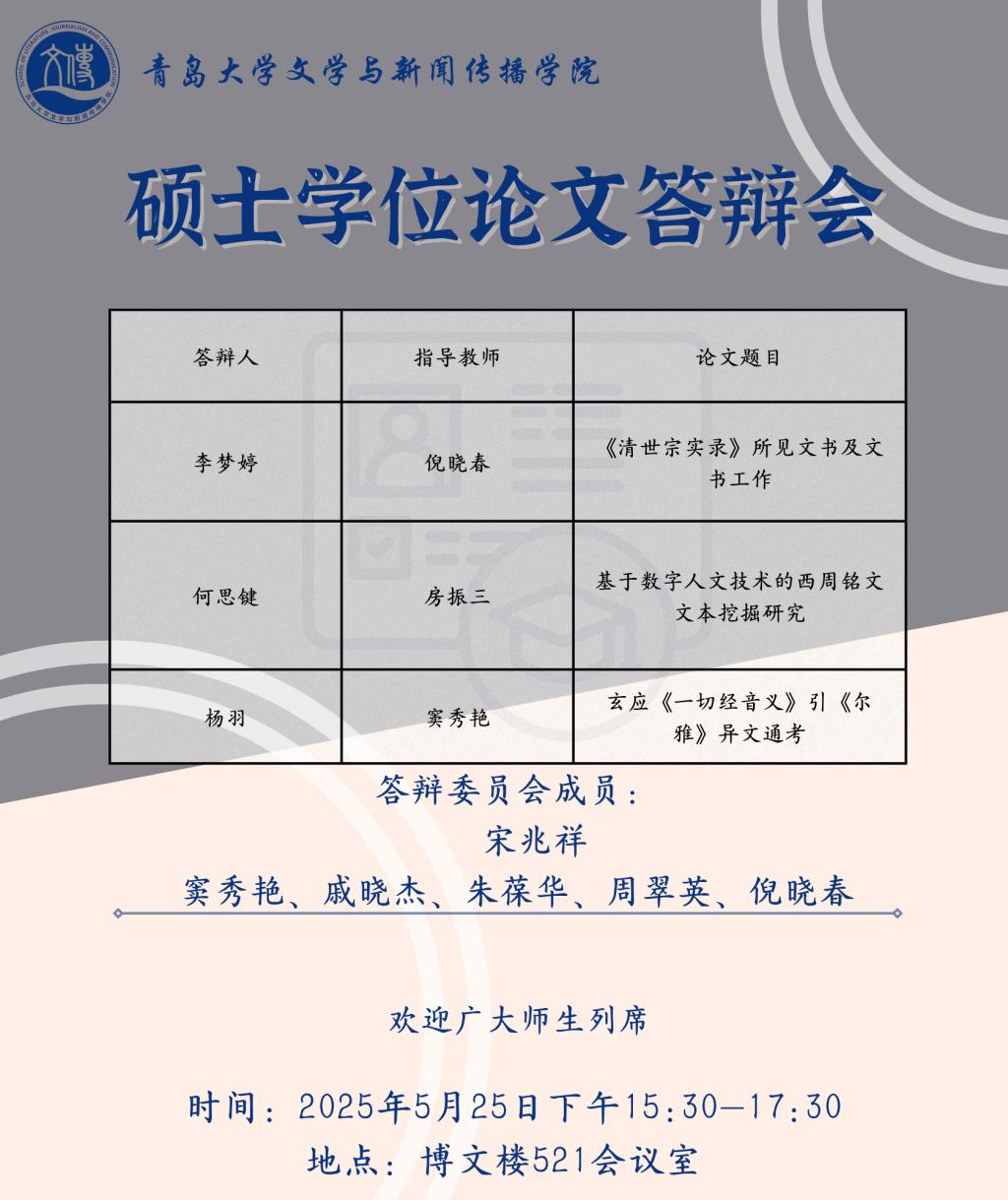 黑料 将于5月19日至5月25日进行文艺学、汉语言文字学、中国古典文献学、中国古代文学、中国现当代文学、比较文学与世界文学、新闻与传播、学科语文(全日制)、学科语文(非全日制)、广播电视专业的硕士学位论文答辩,欢迎广大师生列席旁听。具体安排如下: