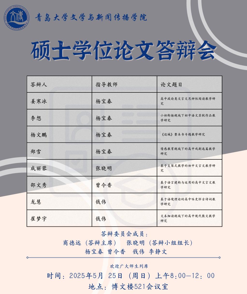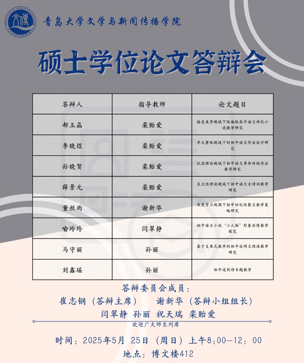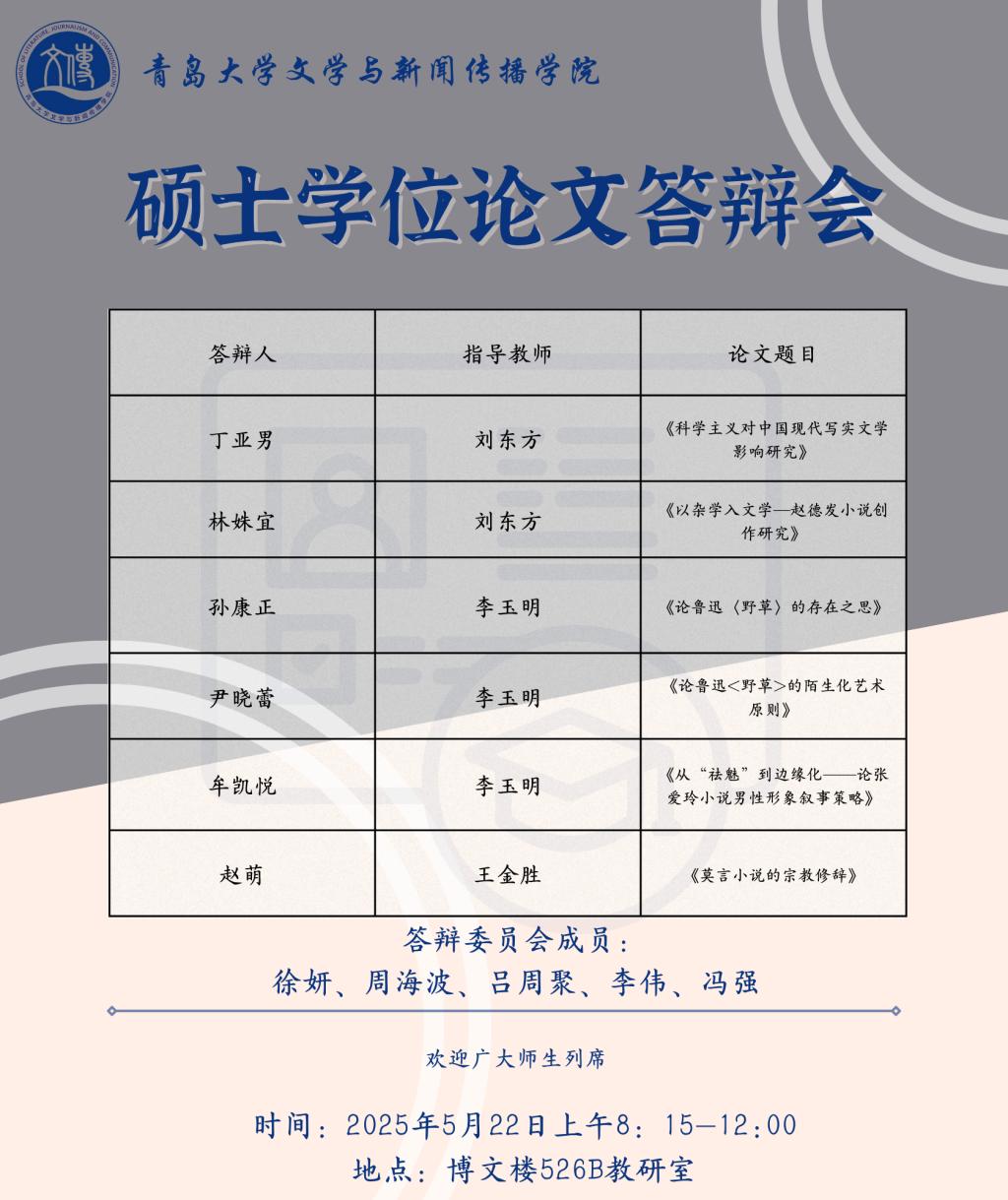 黑料 将于5月19日至5月25日进行文艺学、汉语言文字学、中国古典文献学、中国古代文学、中国现当代文学、比较文学与世界文学、新闻与传播、学科语文(全日制)、学科语文(非全日制)、广播电视专业的硕士学位论文答辩,欢迎广大师生列席旁听。具体安排如下: