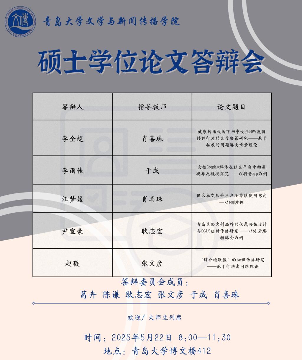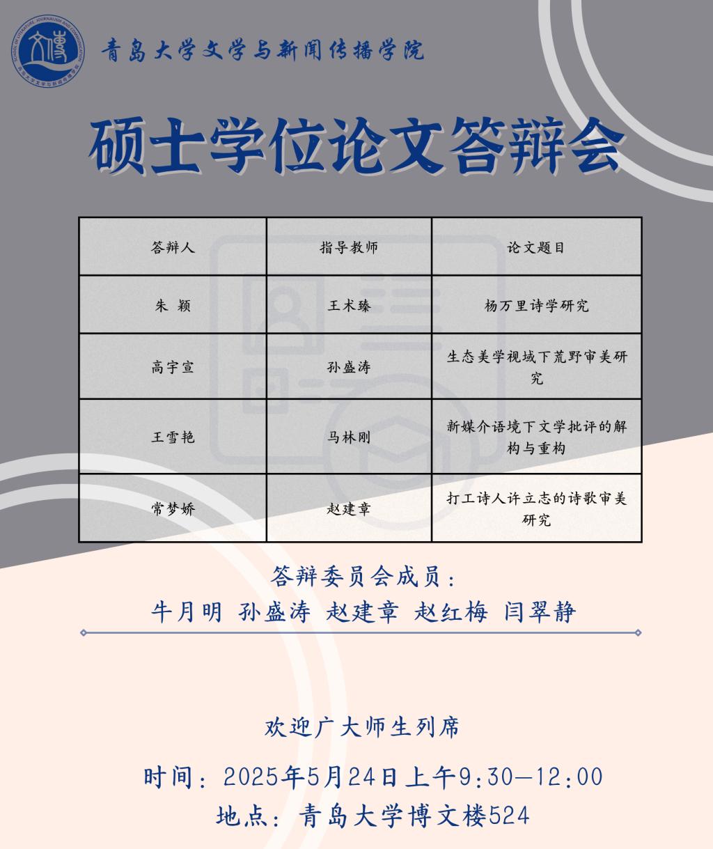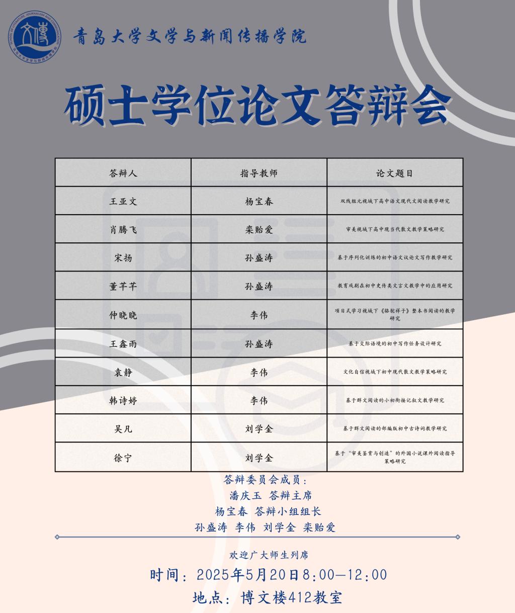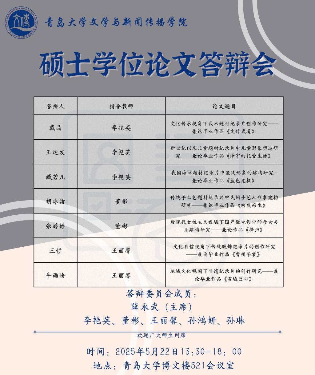 黑料 将于5月19日至5月25日进行文艺学、汉语言文字学、中国古典文献学、中国古代文学、中国现当代文学、比较文学与世界文学、新闻与传播、学科语文(全日制)、学科语文(非全日制)、广播电视专业的硕士学位论文答辩,欢迎广大师生列席旁听。具体安排如下: