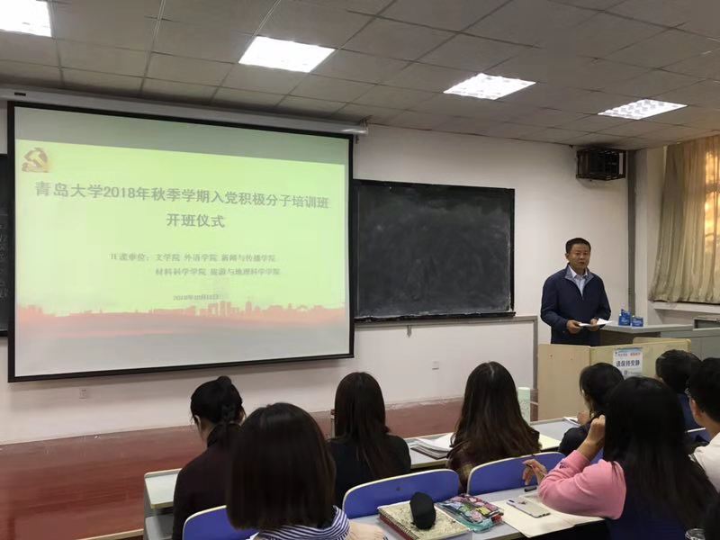 10月12日,2018年秋季学期入党积极分子培训班开班仪式及第一次党课于浮山校区博学楼102教室举行。此次培训班的开课单位包括文学院、外语学院、新闻与传播学院、材料科学学院和旅游与地理科学学院,文学院作为牵头单位,组织举行了此次开班仪式。文学院党委书记杨立华、党委副书记张辉,文学院学生党支部书记李晨曦出席了此次仪式,五个学院163名学员同学参加了培训。