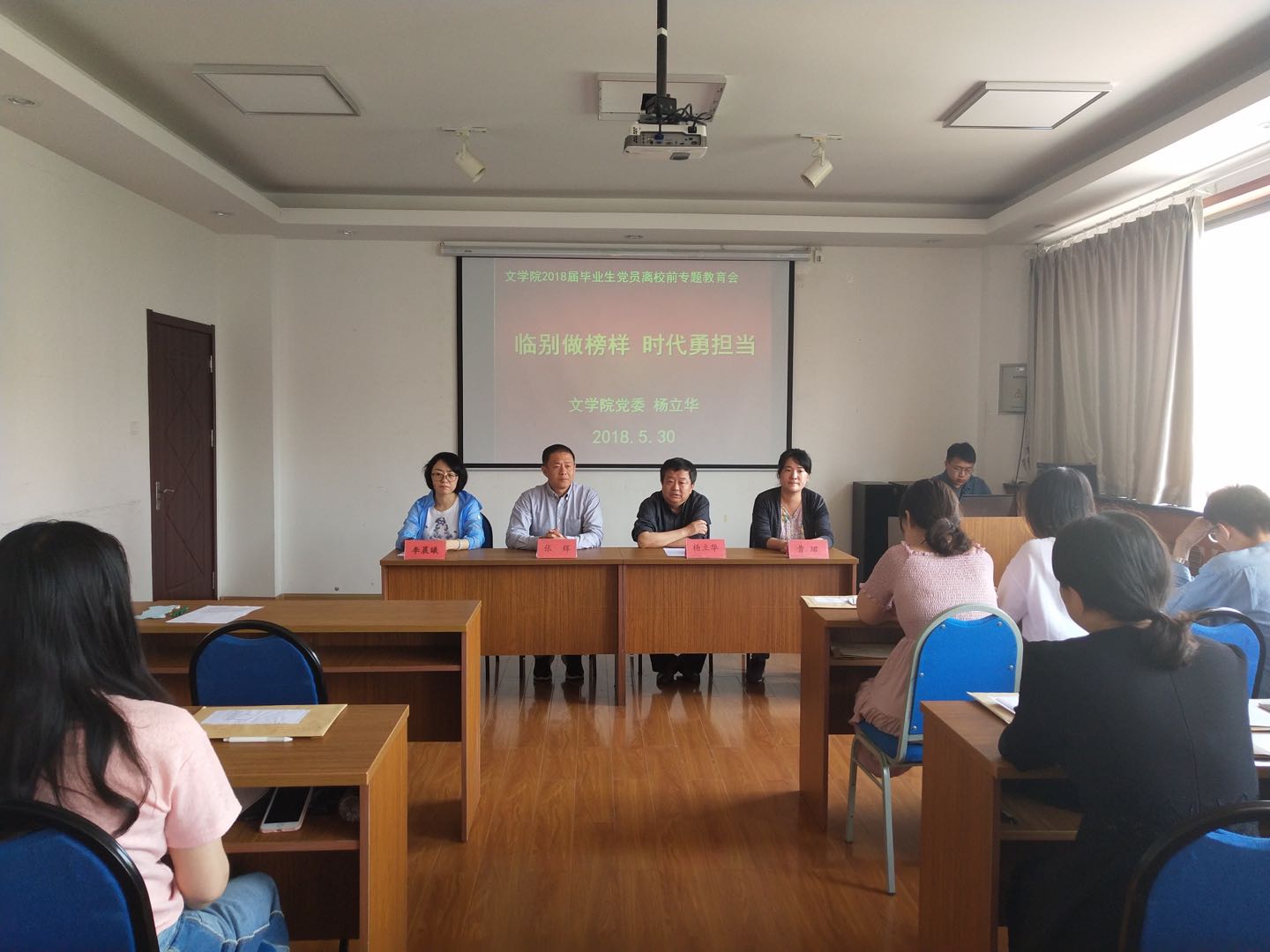 5月30日上午,文学院在博文楼五楼会议室举行2018届毕业生党员离校前专题教育会。文学院党委书记杨立华、副书记张辉、学生工作党支部书记李晨曦、院团委书记、毕业生辅导员曹珺出席会议。文学院全体毕业生党员参会。曹珺主持会议。