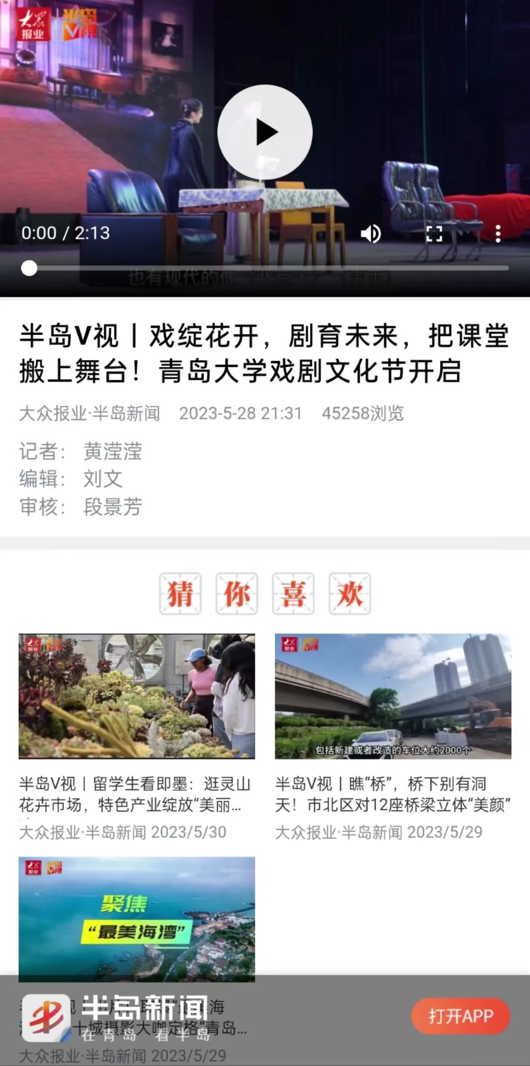 山东大众报业 “半岛V视”新闻客户端5月28日以《半岛V视|戏绽花开,剧育未来,把课堂搬上舞台!黑料