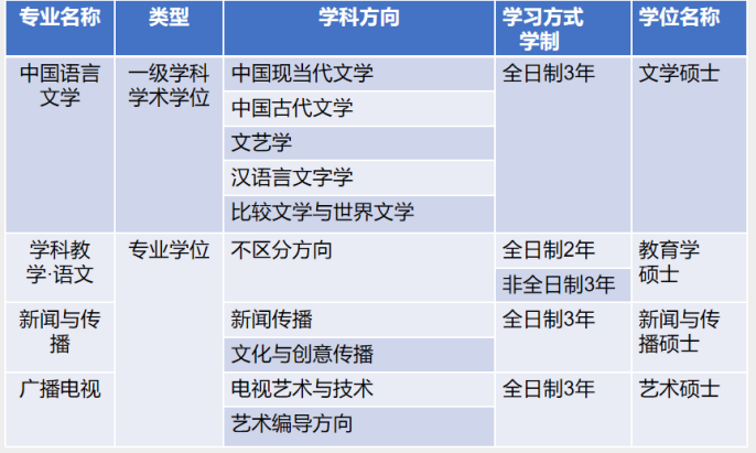 中国语言文学一级学科硕士点下设中国现当代文学、中国古代文学、汉语言文字学、文艺学、比较文学与世界文学5个学术型方向,另有学科教学·语文(全日制和非全日制)、新闻与传播、广播电视(艺术)三个专业硕士点。在校本科生1600余人,研究生200余人,留学生十余人。