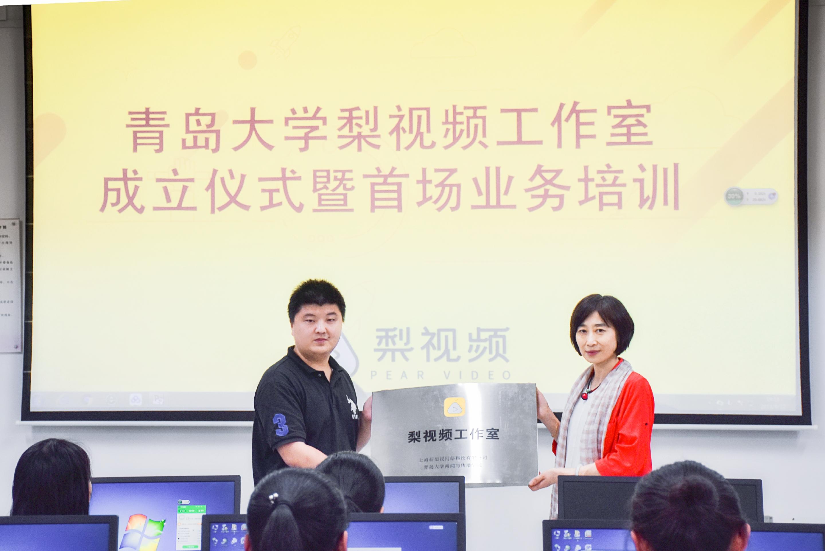 图一:新闻与传播学院院长赵秀凤和梨视频青岛频道主编周超为工作室揭牌