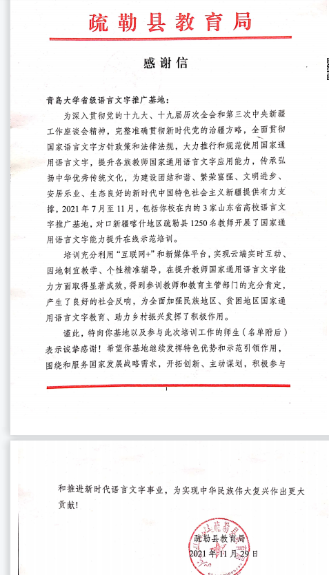 两次普通话培训收获学员教师们的一致好评,疏勒县教育局特来信致谢黑料