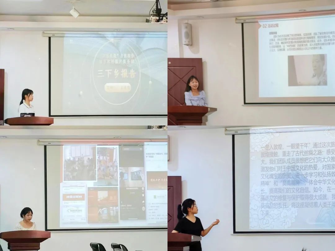 暑期“三下乡”社会实践答辩会在博文楼521会议室举行。辅导员张成、孙晓萱、包蓓蓓、王宁宁出席会议并参与评审,本科生王萍主持会议。