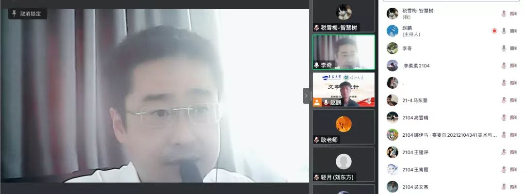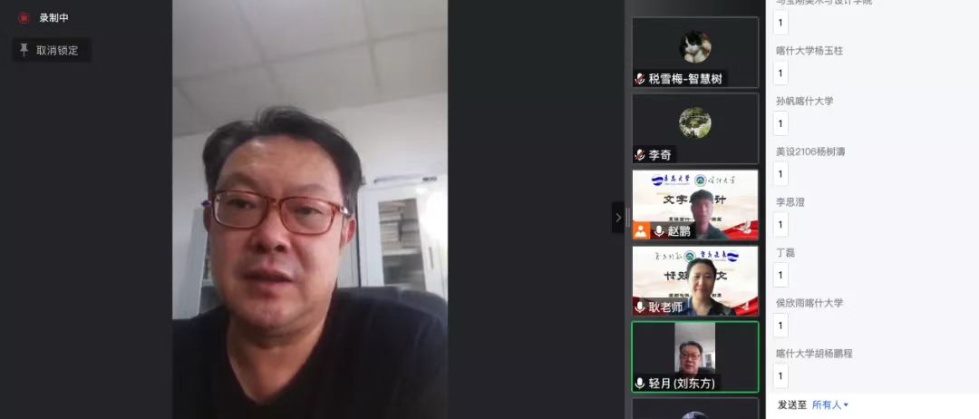最后,主持人赵鹏老师对耿老师的课程做了总结并再次表示感谢,期待继续指导教学。耿志宏老师回应,对赵老师的邀请表示感谢,希望通过此课引起学生们对汉字文化和创意设计的兴趣,提高创意与设计实践能力,为祖国建设贡献力量;两所学校分别位于祖国的东、西部,希望疫情过后欢迎新疆喀什大学的老师和同学们来黑料