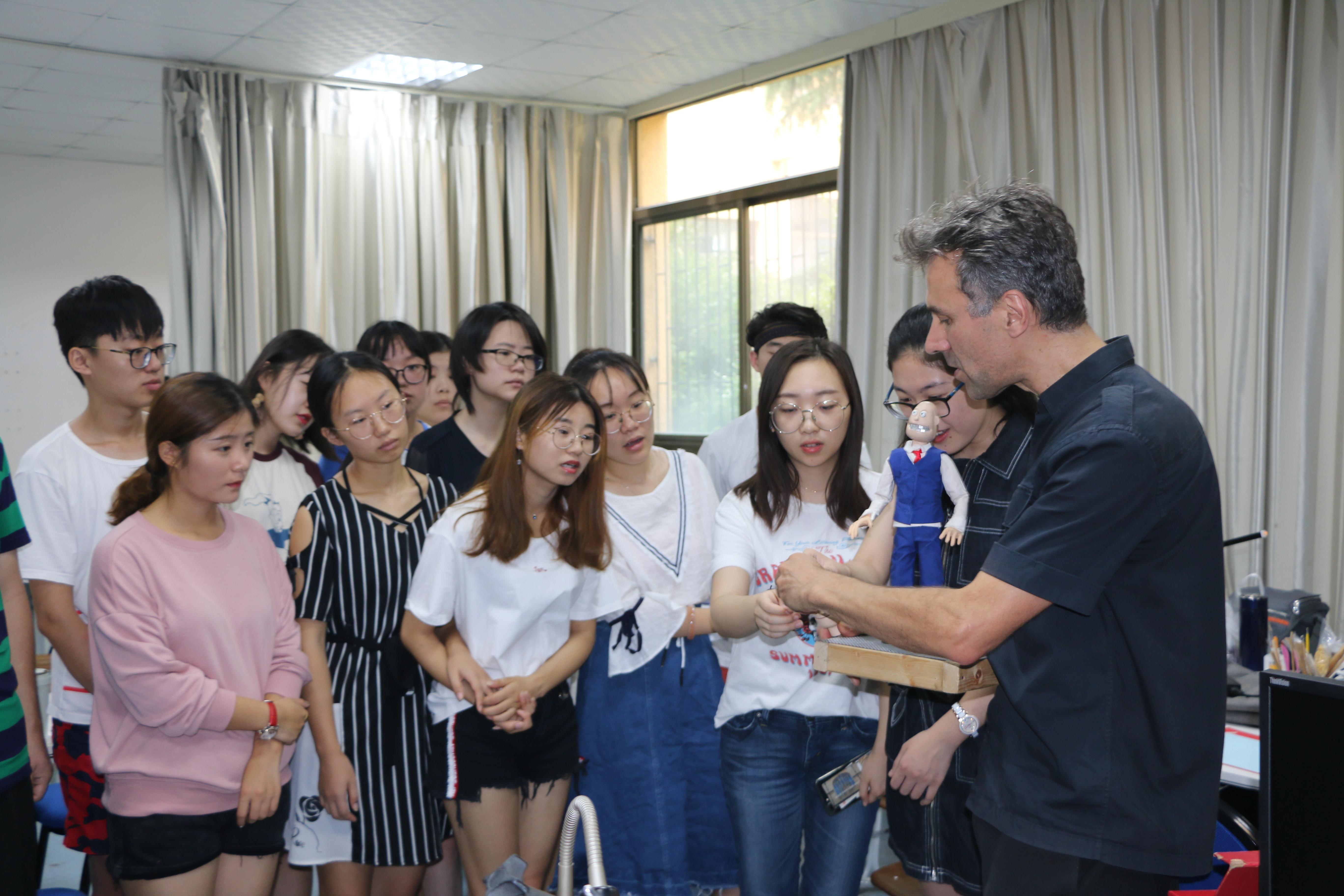本次工作坊为期一周,主要教授定格动画人物设计和拍摄。berto老师有着35年定格动画的创作经验,曾在柏林和哥伦比亚成功举办过多场定格动画工作坊。开场他就用有趣的橡皮泥表演迅速破冰,拉近了和同学们的距离。虽然语言交流有些不便,但有着丰富哑剧表演经验的他能够把复杂的动画知识用夸张的表情和肢体传神地表达,同学们在欢笑中就已然将知识点领悟于心。每次Alberto老师在台前做课堂示范,大家总忍不住凑上前来好奇地围成一团,互动密切。专业耐心的辅导、积极肯定的鼓励让Alberto老师在短短一周内赢得全体同学的尊重和喜爱。