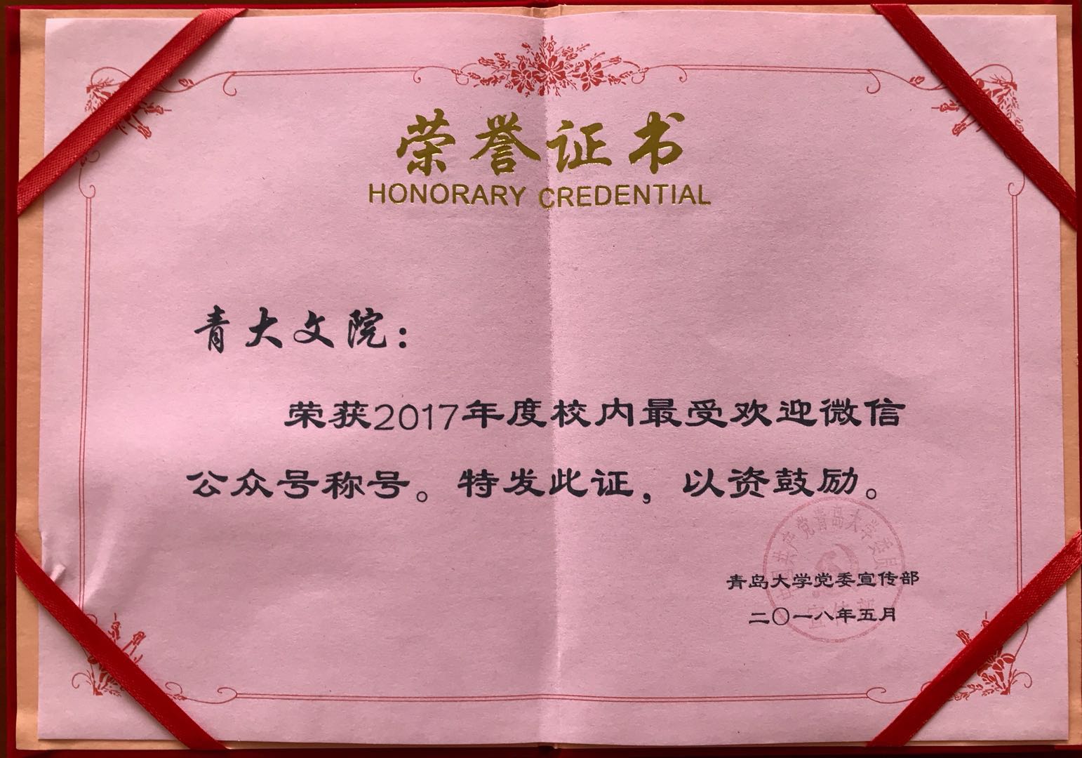 会上对2017年度新闻宣传工作进行了表彰,文学院网站荣获2017年度优秀网站称号,文学院“青大文院”荣获2017年度校内最受欢迎微信公众号称号。